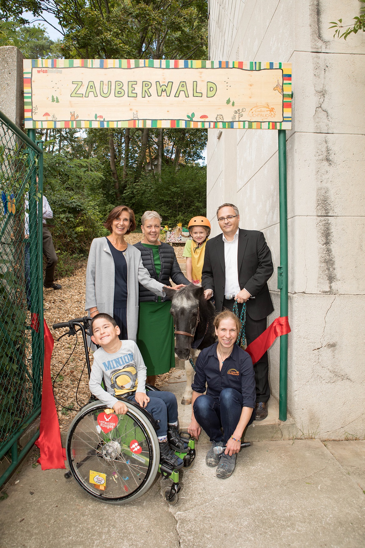 Eröffnung des Zauberwaldes v.l.n.r: Monika Schönerklee-Grasser, Sigrid Oblak, Martin Glenk (alle Wien Holding), Roswitha Zink (sitzend) mit Kindern und Pferd vom e.motion-Lichtblickhof