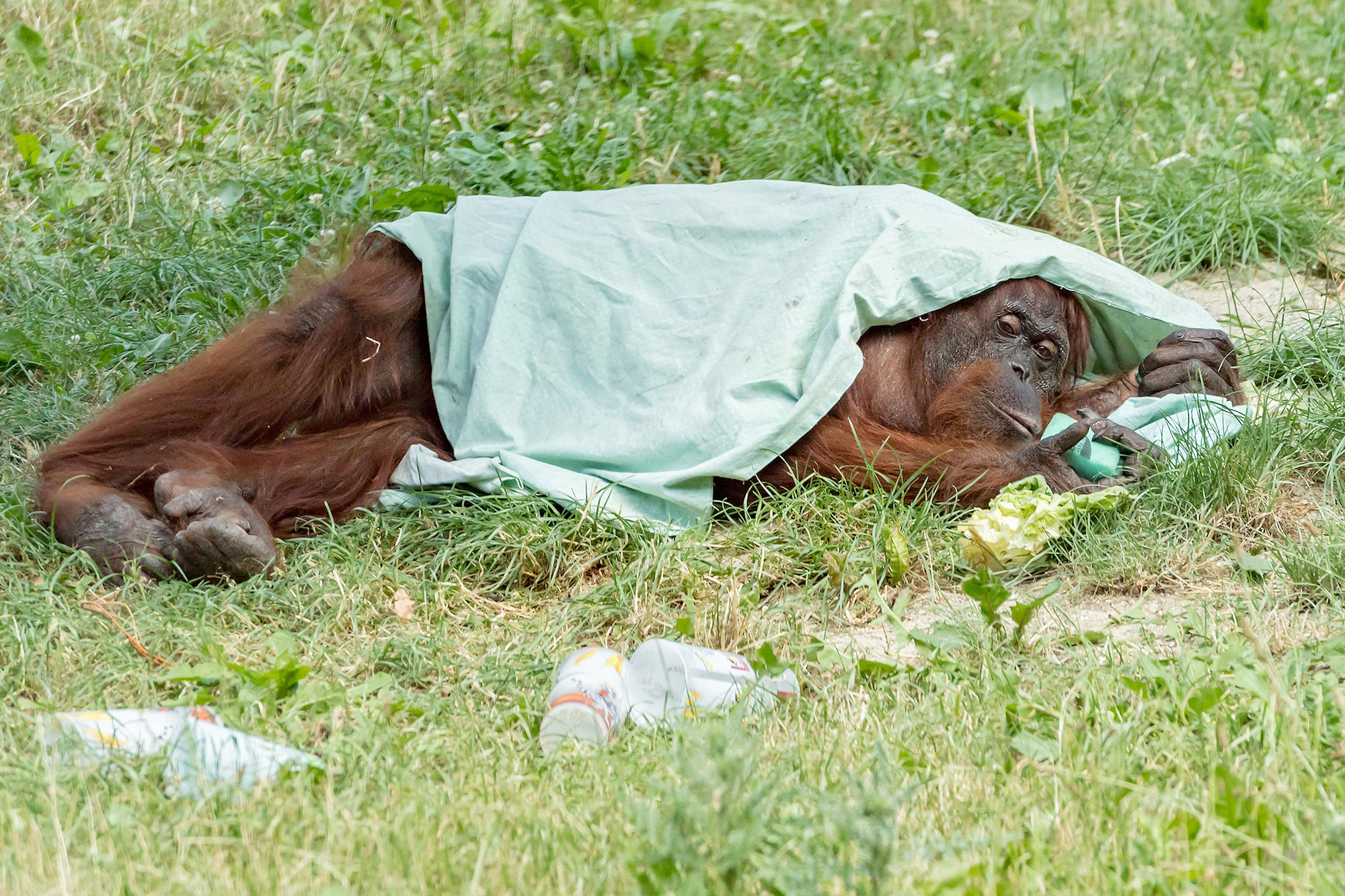 Die Pfleger überlegen sich immer wieder Neues, um das Pritscheln spannend zu machen: von Bechern bis zu Badeenten. Die drei Tiere schätzen das Wasser auf unterschiedliche Art und Weise. Tierpfleger Fredi Maier: „Sol füllt gerne Becher mit Wasser an, trinkt zur Abkühlung ein paar Schlucke oder lässt sich das Wasser direkt aus dem Schlauch in den Mund laufen.“ Die fast 55 Jahre alte Mota geht es gemütlicher an. Sie lässt Schwämme vollsaugen, um sich dann mit ihnen in den Schatten zurückzuziehen und zu spielen. Am liebsten noch mit einem Tuch zugedeckt – als Sonnenschutz. Von Orang-Utans kann man einiges lernen. Das Männchen Vladimir beweist gerne seine Kraft. „Er wirft die Tonne so oft um, bis er von oben bis unten nass ist. Und wir gleich mit, wenn er besonders wild ist“, schmunzelt Maier.